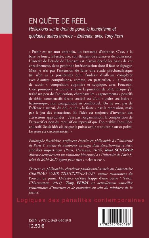 Ce livre est l'aboutissement d'un entretien avec le philosophe René Schérer. Au cours d'une discussion libre et vivante, il livre ses réflexions sur les pénalités contemporaines et le sens du système punitif actuel et nous fait partager ses analyses subtiles portant notamment sur les notions de désir, d'hospitalité et d'harmonie sociétaire. On se laisse ici entraîner par sa manière originale de faire de la philosophie.