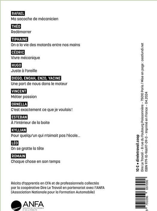 Les apprenti·es et jeunes professionnel·les de la réparation automobile adorent parler de leur travail ! Dans ce recueil de récits, douze d’entre eux partagent leur expérience d’entrée dans un monde professionnel, celui des garages automobiles, moto ou poids lourd. Ils ont raconté aux collecteurs de la coopérative Dire Le Travail leurs découvertes, leurs questions persistantes parfois, leur enthousiasme souvent. Au-delà de l’image d’un métier manuel, elles et ils disent la réflexion à mener pour faire le bon diagnostic, pour trouver le bon geste, pour la bonne procédure, le plaisir à se heurter à des problèmes qui sortent de l’ordinaire et qui engagent la finesse de leur intelligence : des « chercheur·es en moteurs », toujours en quête de perfection ! Les métiers de la réparation automobile sont des métiers de relation : avec la machine, le client, les collègues. Un métier en constante évolution aussi, en particulier avec l’arrivée de la voiture électrique, qui ne semble pas être un problème pour les jeunes. Un métier d’avenir, sans doute, et de responsabilité. Car ces professionnel·les ont la vie des autres entre leurs mains ! Livre réalisé en partenariat avec l’ANFA, organisme en charge de la mise en œuvre des dispositifs de formation des Services de l’automobile.