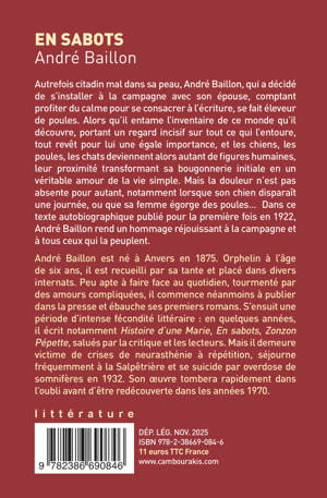 Autrefois citadin mal dans sa peau, André Baillon, qui a décidé de s'installer à la campagne avec son épouse, comptant profiter du calme pour se consacrer à l'écriture, se fait éleveur de poules. Alors qu'il entame l'inventaire de ce monde qu'il découvre, portant un regard incisif sur tout ce qui l'entoure, tout revêt pour lui une égale importance, et les chiens, les poules, les chats deviennent alors autant de figures humaines, leur proximité transformant sa bougonnerie initiale en un véritable amour de la vie simple. Mais la douleur n'est pas absente pour autant, notamment lorsque son chien disparaît une journée, ou que sa femme égorge des poules... Dans ce texte autobiographique publié pour la première fois en 1922, André Baillon rend un hommage réjouissant à la campagne et à tous ceux qui la peuplent. André Baillon est né à Anvers en 1875. Orphelin à l'âge de six ans, il est recueilli par sa tante et placé dans divers internats. Peu apte à faire face au quotidien, tourmenté par des amours compliquées, il commence néanmoins à publier dans la presse et ébauche ses premiers romans. S'ensuit une période d'intense fécondité littéraire : en quelques années, il écrit notamment Histoire d'une Marie, En sabots, Zonzon Pépette, salués par la critique et les lecteurs. Mais il demeure victime de crises de neurasthénie à répétition, séjourne fréquemment à la Salpêtrière et se suicide par overdose de somnifères en 1932. Son oeuvre tombera rapidement dans l'oubli avant d'être redécouverte dans les années 1970.