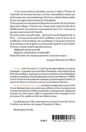 Une conversation entendue, un jour a midi, a l'heure de l'aperitif, a la terrasse d'un bar, a Corte, ressemblait comme une petite soeur aux conversations que Ciceron a relatees dans nombre de ses ouvrages, surtout dans les Tusculanes. Ciceron parle avec les morts et fait parler les morts. De la a l'inviter dans mon village, a Vivario ou, comme dans toutes les iles de la Mediterranee, les morts ne nous quittent pas, il n'y avait qu'un pas que nous avons vite franchi. Et nous avons eu neufs nuits - qui font les neuf chapitres de ce livre - ou nous avons parle de la vieillesse et de la mort, de la souffrance et du bonheur, de la politique et du gouvernement, de la richesse et de la gloire, et, surtout de la patrie et de l'amitie. Ciceron, comme tous les grands anciens, "deployait comme une aile" "la ferme volonte de sa vie eternelle." Seule l'eternite est vraiment presente a tous les temps.