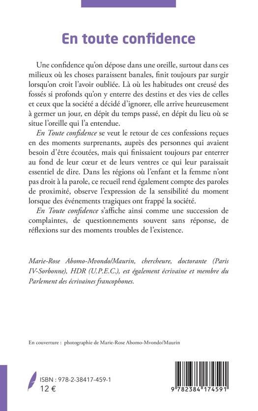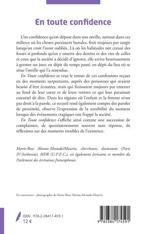 Une confidence qu'on dépose dans une oreille, surtout dans ces milieux où les choses paraissent banales, finit toujours par surgir lorsqu'on croit l'avoir oubliée. Là où les habitudes ont creusé des fossés si profonds qu'on y enterre des destins et des vies de celles et ceux que la société a décidé d'ignorer, elle arrive heureusement à germer un jour, en dépit du temps passé, en dépit du lieu où se situe l'oreille qui l'a entendue. En Toute confidence se veut le retour de ces confessions reçues en des moments surprenants, auprès des personnes qui avaient besoin d'être écoutées, mais qui finissaient toujours par enterrer au fond de leur cur et de leurs ventres ce qui leur paraissait essentiel de dire. Dans les régions où l'enfant et la femme n'ont pas droit à la parole, ce recueil rend également compte des paroles de proximité, observe l'expression de la sensibilité du moment lorsque des événements tragiques ont frappé la société. En Toute confidence s'affiche ainsi comme une succession de complaintes, de questionnements souvent sans réponse, de réflexions sur des moments troubles de l'existence.