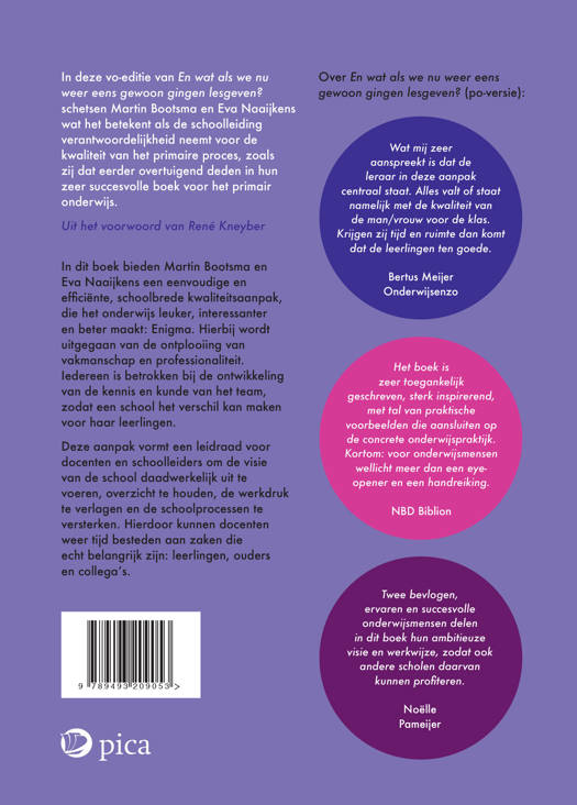 In dit boek bieden Martin Bootsma en Eva Naaijkens een eenvoudige en efficiënte, schoolbrede kwaliteitsaanpak, die het onderwijs leuker, interessanter en beter maakt: Enigma. Hierbij wordt uitgegaan van de ontplooiing van vakmanschap en professionaliteit. Iedereen is betrokken bij de ontwikkeling van de kennis en kunde van het team, zodat een school het verschil kan maken voor haar leerlingen.