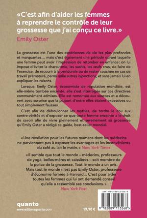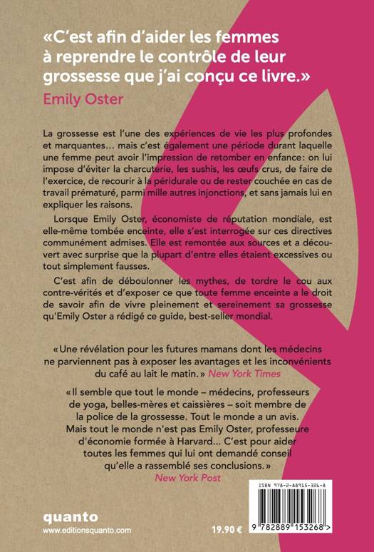 La grossesse est l'une des expériences de vie les plus profondes et marquantes… mais c'est également une période durant laquelle une femme peut avoir l'impression de retomber en enfance: on lui impose d'éviter la charcuterie, les sushis, les oeufs crus, de faire de l'exercice, de recourir à la péridurale ou de rester couchée en cas de travail prématuré, parmi mille autres injonctions, et sans jamais lui en expliquer les raisons. Lorsque Emily Oster, économiste de réputation mondiale, est elle-même tombée enceinte, elle s'est interrogée sur ces directives communément admises. Elle est remontée aux sources et a découvert avec surprise que la plupart d'entre elles étaient excessives ou tout simplement fausses. C'est afin de déboulonner les mythes, de tordre le cou aux contre-vérités et d'exposer ce que toute femme enceinte a le droit de savoir afin de vivre pleinement et sereinement sa grossesse qu'Emily Oster a rédigé ce guide, best-seller mondial. « J'ai écrit ce livre pour aider les femmes à reprendre le contrôle de leur grossesse. » — Emily Oster — « Emily Oster donne des chiffres clairs pour s'y retrouver et faire des choix éclairés… sans tomber dans la panique ! » — Parents — « Pour une grossesse sereine, informée et adaptée à chaque femme enceinte. » — Bébé Nature — « Un texte vraiment juste et qui devrait parler à beaucoup d'entre vous. » — Parole de Mamans — « Assez décomplexant et basé sur des sources fiables. À mettre dans les mains de futures mamans. » — Heidi News —
