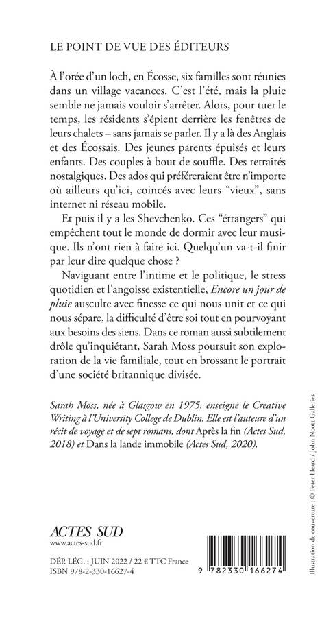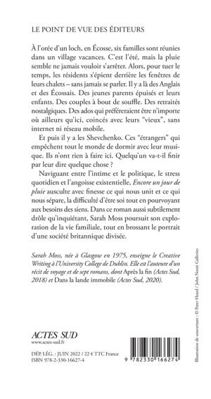 À l'orée d'un loch, en Écosse, six familles sont réunies dans un village vacances. C'est l'été, mais la pluie semble ne jamais vouloir s'arrêter. Alors, pour tuer le temps, les résidents s'épient derrière les fenêtres de leurs chalets - sans jamais se parler. Il y a là des Anglais et des Écossais. Des jeunes parents épuisés et leurs enfants. Des couples à bout de souffle. Des retraités nostalgiques. Des ados qui préféreraient être n'importe où ailleurs qu'ici, coincés avec leurs "vieux", sans internet ni réseau mobile. Et puis il y a les Shevchenko. Ces "étrangers" qui empêchent tout le monde de dormir avec leur musique. Ils n'ont rien à faire ici. Quelqu'un va-t-il finir par leur dire quelque chose ? Naviguant entre l'intime et le politique, le stress quotidien et l'angoisse existentielle, "Encore un jour de pluie" ausculte avec finesse ce qui nous unit et ce qui nous sépare, la difficulté d'être soi tout en pourvoyant aux besoins des siens. Dans ce roman aussi subtilement drôle qu'inquiétant, Sarah Moss poursuit son exploration de la vie familiale, tout en brossant le portrait d'une société britannique divisée.