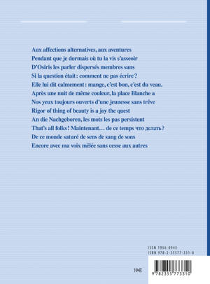 Encore une fois nos voix mêlées sans cesse au monde compte XII chants de 24 strophes de 12 vers chacune. Ce polylogue dispersé est né sous le signe d'Apollinaire, celui du monostyche pour la forme, de Lundi rue Christine pour l'idée de départ et essaie de donner voix à toutes celles, intérieures et extérieures, connues ou inconnues, qui nous traversent, parlent du monde et nous parlent. Voix ici pliées et dépliées au rythme du spectre qui hante la poésie française, le refoulé (qui revient toujours), le dodécasyllabe dit alexandrin dans toutes ses coupes possibles. Un alexandrin où le e " muet " joue à la fois au furet de la chanson et au mistigri, souvent passé à la trappe du parler français parisien quotidien. L'alexandrin parisien, souvent donc, muet visible. Un alexandrin parfois arraché à ses créateurs - involontaires ou non - comme on décolle d'un mur de la ville des épaisseurs d'affiches dont les mots et les images alors s'entremêlent dans leurs déchirures. Un alexandrin où peuvent aussi se croiser en ritournelle, et partager un vers, des voix déjà là, comme ici Marx et Rimbaud, Racine et Aznavour, Apollinaire et Edith Piaf, Eluard et Berthe Sylva, Hugo et Boby Lapointe, et bien d'autres encore, comme André, Louis, Tristan, Stéphane, Paul, Charles, Alphonse, Victor, et ce qui peut se vivre, se lire, se rêver, se dire dans une épopée façon puzzle.Et c'est aussi une façon d'autobiographie, individuelle et collective. Une autobiographie quotidienne au fil du temps et des années où ce que j'ai/nous avons lu, vu, entendu et rêvé fait partie de notre vie comme ce que nous avons vécu, ressenti et imaginé.
