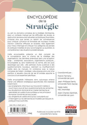 Cette encyclopédie présente un état complet de la connaissance dans le champ de la stratégie des organisations, ces dernières entendues dans une acception large - entreprises, associations, organisations publiques... Encyclopédie au sens traditionnel du terme, elle est aussi davantage que cela : elle participe d'une ouverture à des questionnements nouveaux, rarement ou insuffisamment traités dans les manuels. En cohérence avec la nature complexe de l'objet « stratégie », elle propose ainsi une riche partition à laquelle chacune de ses 81 entrées apporte le concours d'une expertise spécifique.