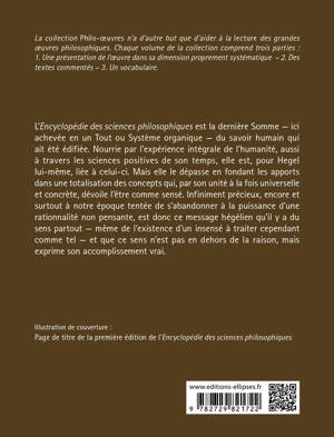 L'Encyclopédie des sciences philosophiques est la dernière Somme — ici achevée en un Tout ou Système organique — du savoir humain qui ait été édifiée. Nourrie par l'expérience intégrale de l'humanité, aussi à travers les sciences positives de son temps, elle est, pour Hegel lui-même, liée à celui-ci. Mais elle le dépasse en fondant les apports dans une totalisation des concepts qui, par son unité à la fois universelle et concrète, dévoile l'être comme sensé. Infiniment précieux, encore et surtout à notre époque tentée de s'abandonner à la puissance d'une rationalité non pensante, est donc ce message hégélien qu'il y a du sens partout — même de l'existence d'un insensé à traiter cependant comme tel — et que ce sens n'est pas en dehors de la raison, mais exprime son accomplissement vrai.