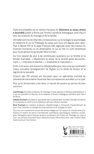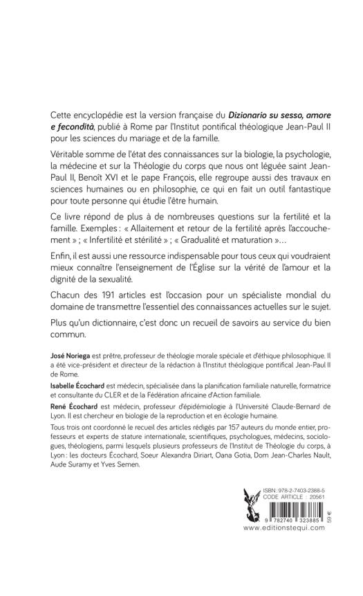 Cette Encyclopédie est la version française du Dizionario su sesso, amore e fecondità publié à Rome par l'Institut pontifical théologique Jean‐Paul II pour les sciences du mariage et de la famille. C’est une véritable somme de l'état des connaissances sur le corps, la psychologie et sur la Théologie du Corps que nous a légué saint Jean‐Paul II. Il s’agit d’une véritable encyclopédie : elle regroupe des articles de biologie, de théologie, de médecine, mais aussi des travaux en sciences humaines ou en philosophie. C'est un outil fantastique pour toute personne qui étudie l'être humain. Ce livre répond à de nombreuses questions sur la fertilité et la famille. Exemples : " Allaitement et retour de la fertilité après l'accouchement" , "Jean‐Paul II (Karol Wojtyła) sur la sexualité" , "Infertilité et stérilité" , "Gradualité et maturité"… Les 170 articles du dictionnaire sont rédigés par plus de 157 professeurs et experts de stature internationale, parmi lesquels plusieurs professeurs.