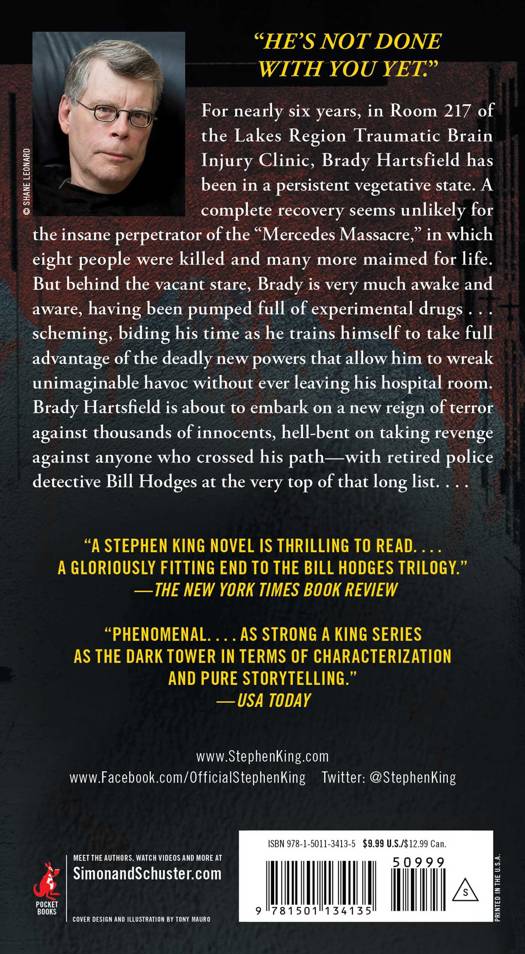 For nearly six years, in Room 217 of the Lakes Region Traumatic Brain Injury Clinic, Brady Hartsfield has been in a persistent vegetative state. A complete recovery seems unlikely for the insane perpetrator of the "Mercedes Massacre," in which eight people were killed and many more maimed for life. But behind the vacant stare, Brady is very much awake and aware, having been pumped full of experimental drugs...scheming, biding his time as he trains himself to take full advantage of the deadly new powers that allow him to wreak unimaginable havoc without ever leaving his hospital room. Brady Hartsfield is about to embark on a new reign of terror against thousands of innocents, hell-bent on taking revenge against anyone who crossed his path--with retired police detective Bill Hodges at the very top of that long list....