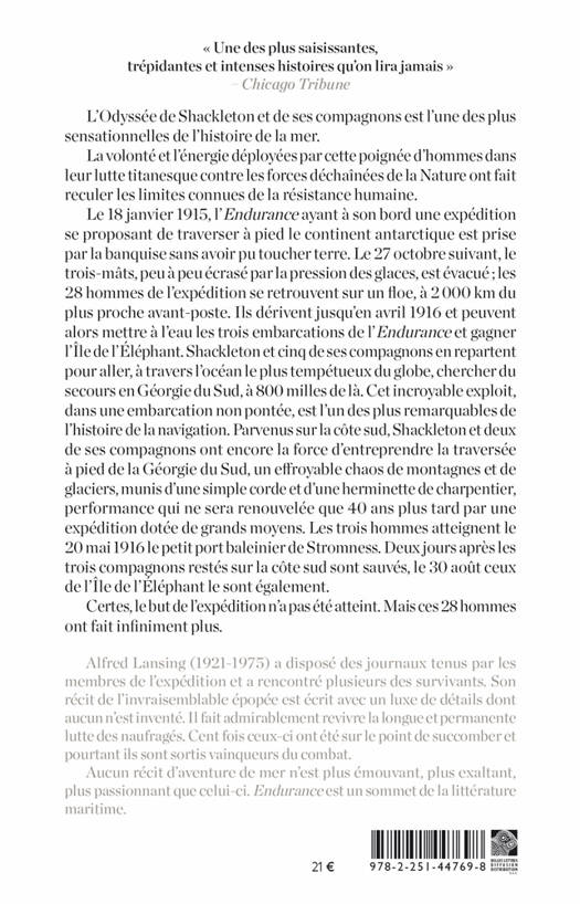 L'Odyssee de Shackleton et de ses compagnons est l'une des plus sensationnelles de l'histoire de la mer. La volonte et l'energie deployees par cette poignee d'hommes dans leur lutte titanesque contre les forces dechainees de la Nature ont fait reculer les limites connues de la resistance humaine. Le 18 janvier 1915, l'Endurance ayant a son bord une expedition se proposant de traverser a pied le continent antarctique est prise par la banquise sans avoir pu toucher terre. Le 27 octobre suivant, le trois-mats, peu a peu ecrase par la pression des glaces, est evacue; les 28 hommes de l'expedition se retrouvent sur un floe, a 2 000 km du plus proche avant-poste. Ils derivent jusqu'en avril 1916 et peuvent alors mettre a l'eau les trois embarcations de l'Endurance et gagner l'Ile de l'Elephant. Shackleton et cinq de ses compagnons en repartent pour aller, a travers l'ocean le plus tempetueux du globe, chercher du secours en Georgie du Sud, a 800 milles de la. Cet incroyable exploit, dans une embarcation non pontee, est l'un des plus remarquables de l'histoire de la navigation. Parvenus sur la cote sud, Shackleton et deux de ses compagnons ont encore la force d'entreprendre la traversee a pied de la Georgie du Sud, un effroyable chaos de montagnes et de glaciers, munis d'une simple corde et d'une herminette de charpentier, performance qui ne sera renouvelee que 40 ans plus tard par une expedition dotee de grands moyens. Les trois hommes atteignent le 20 mai 1916 le petit port baleinier de Stromness. Deux jours apres les trois compagnons restes sur la cote sud sont sauves, le 30 aout ceux de l'Ile de l'Elephant le sont egalement. Certes, le but de l'expedition n'a pas ete atteint. Mais ces 28 hommes ont fait infiniment plus.