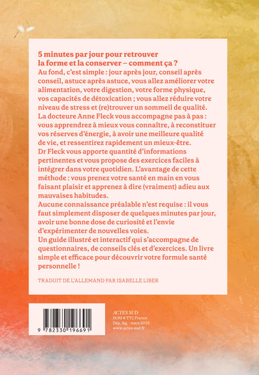 5 minutes par jour pour retrouver la forme et la conserver - comment ça ? Au fond, c'est simple : jour après jour, conseil après conseil, astuce après astuce, vous allez améliorer votre alimentation, votre digestion, votre forme physique, vos capacités de détoxication ; vous allez réduire votre niveau de stress et (re)trouver un sommeil de qualité. La docteure Anne Fleck vous accompagne pas à pas : vous apprendrez à mieux vous connaître, à reconstituer vos réserves d'énergie, à avoir une meilleure qualité de vie, et ressentirez rapidement un mieux-être. Dr Fleck vous apporte quantité d'informations pertinentes et vous propose des exercices faciles à intégrer dans votre quotidien. L'avantage de cette méthode : vous prenez votre santé en main en vous faisant plaisir et apprenez à dire (vraiment) adieu aux mauvaises habitudes. Aucune connaissance préalable n'est requise : il vous faut simplement disposer de quelques minutes par jour, avoir une bonne dose de curiosité et l'envie d'expérimenter de nouvelles voies. Un guide illustré et interactif qui s'accompagne de questionnaires, de conseils clés et d'exercices. Un livre simple et efficace pour découvrir votre formule santé personnelle !