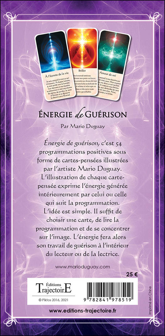 « Énergie de guérison », ce sont 54 programmations positives sous forme de cartes-pensées illustrées par l’artiste Mario Duguay. L’illustration de chaque carte-pensée exprime l’énergie générée intérieurement par celui ou celle qui suit la programmation. L’idée est simple. Il suffit de choisir une carte, de lire la programmation et de se concentrer sur l’image. L’énergie fera alors son travail de guérison à l’intérieur du lecteur ou de la lectrice.