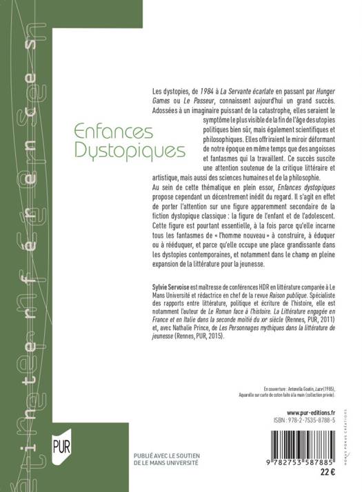 Au sein de cette thématique en plein essor, Enfances dystopiques propose cependant un décentrement inédit du regard. Il s’agit en effet de porter l’attention sur une figure apparemment secondaire de la fiction dystopique classique : la figure de l’enfant et de l’adolescent. Cette figure est pourtant essentielle, à la fois parce qu’elle incarne ; tous les fantasmes de «l’homme nouveau» à construire, à éduquer ou à rééduquer, et parce qu’elle occupe une place grandissante dans les dystopies contemporaines, et notamment dans le champ en pleine expansion de la littérature pour la jeunesse.