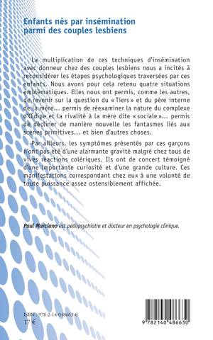 La multiplication de ces techniques d'insémination avec donneur chez des couples lesbiens nous a incités à reconsidérer les étapes psychologiques traversées par ces enfants. Nous avons pour cela retenu quatre situations emblématiques. Elles nous ont permis, comme les autres, de revenir sur la question du Tiers et du père interne de la mère... permis de réexaminer la nature du complexe d'OEdipe et la rivalité à la mère dite sociale ... permis de décliner de manière nouvelle les fantasmes liés aux scènes primitives... et bien d'autres choses. Par ailleurs, les symptômes présentés par ces garçons n'ont pas été d'une alarmante gravité malgré chez tous de vives réactions colériques. Ils ont de concert témoigné d'une importante curiosité et d'une grande culture. Ces manifestations correspondant chez eux à une volonté de toute puissance assez ostensiblement affichée.