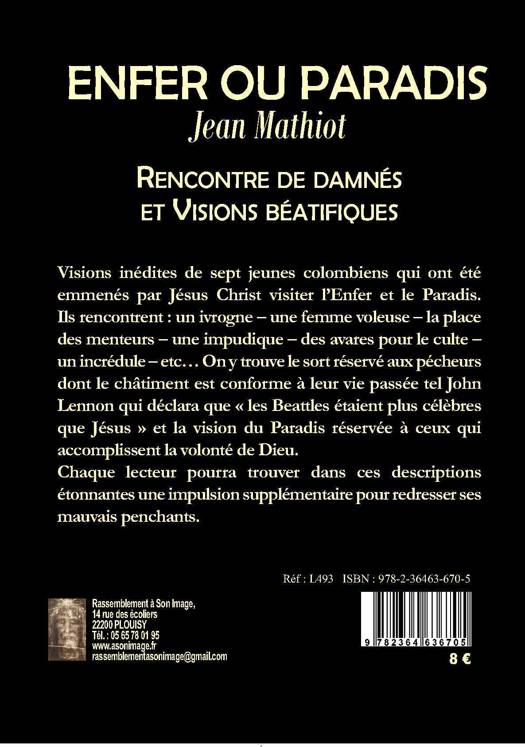 Visions inédites de sept jeunes colombiens qui ont été emmenés par Jésus Christ visiter l'Enfer et le Paradis. Ils rencontrent : Un ivrogne - une femme voleuse - la place des menteurs - une impudique - des avares pour le culte - un incrédule - etc... On y trouve le sort réservé aux pécheurs dont le châtiment est conforme à leur vie passée tel John Lennon qui déclara que « les Beattles étaient plus célèbres que Jésus » et la vision du Paradis réservée à ceux qui accomplissent la volonté de Dieu. Chaque lecteur pourra trouver dans ces descriptions étonnantes une impulsion supplémen-taire pour redresser ses mauvais penchants. AUTEUR Jean Mathiot a étudié la Bible et la théologie, l'histoire de l'Église. Il a participé à l'animation de retraites et de nombreuses rencontres en France et dans le monde. Intéressé par les irruptions divines en ce monde et par l'évolution humaine et spirituelle. Il a écrit plus d'une dizaine d'ouvrage.