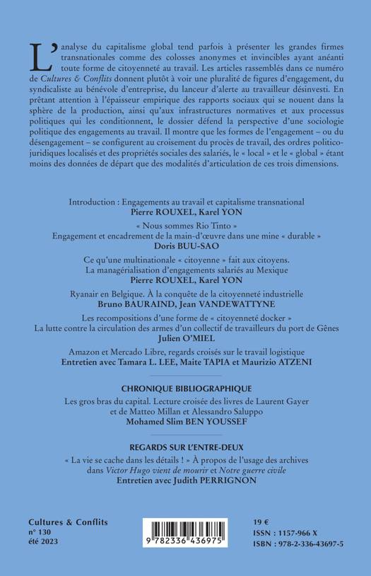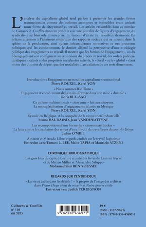 L'analyse du capitalisme global tend parfois à présenter les grandes firmes transnationales comme des colosses anonymes et invincibles ayant anéanti toute forme de citoyenneté au travail. Les articles rassemblés dans ce numéro de Cultures & Conflits donnent plutôt à voir une pluralité de figures d'engagement, du syndicaliste au bénévole d'entreprise, du lanceur d'alerte au travailleur désinvesti. En prêtant attention à l'épaisseur empirique des rapports sociaux qui se nouent dans la sphère de la production, ainsi qu'aux infrastructures normatives et aux processus politiques qui les conditionnent, le dossier défend la perspective d'une sociologie politique des engagements au travail. Il montre que les formes de l'engagement - ou du désengagement - se configurent au croisement du procès de travail, des ordres politico-juridiques localisés et des propriétés sociales des salariés, le local et le global étant moins des données de départ que des modalités d'articulation de ces trois dimensions.