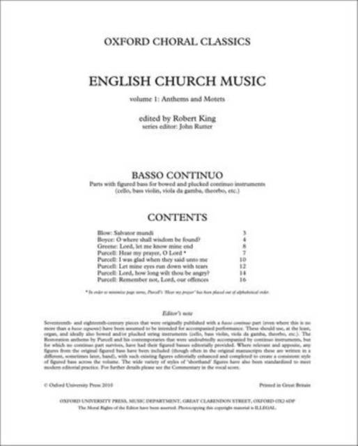 Oxford Choral Classics: English Church Music assembles in two volumes around 100 of the finest examples of English sacred choral music of the past five centuries. This publication presents basso continuo parts, suitable for bowed or plucked instruments, for eight of the anthems/motets in volume 1.
