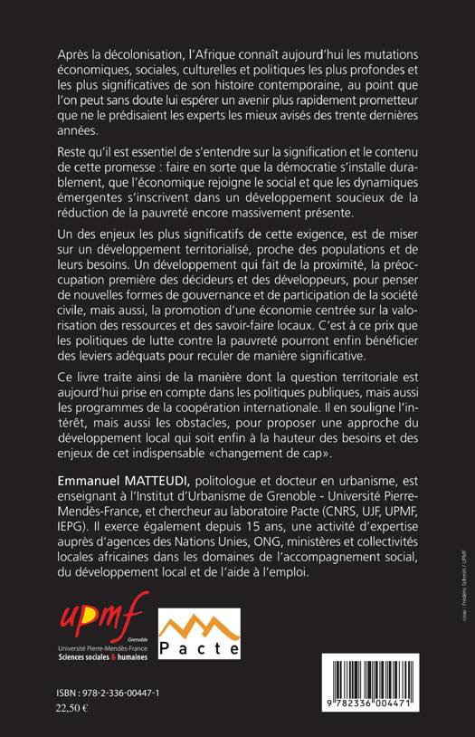 Ce livre traite de la manière dont la question territoriale est aujourd'hui prise en compte dans les politiques publiques en Afrique, mais aussi les programmes de la coopération internationale. Il en souligne l'intérêt, mais aussi les obstacles, pour proposer une approche du développement local qui soit enfin à la hauteur des besoins et des enjeux de cet indispensable "changement de cap".