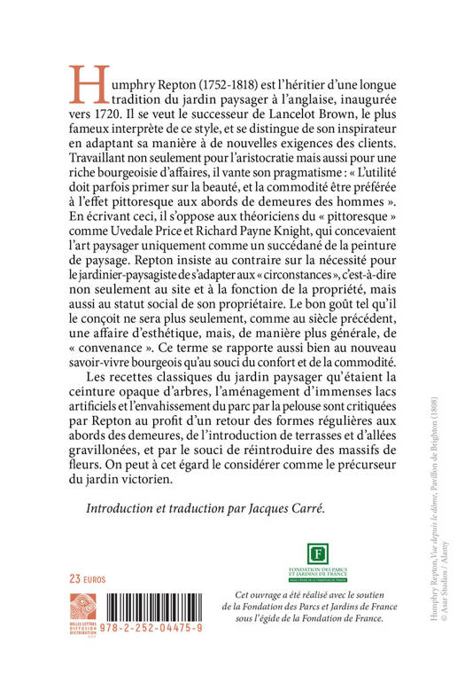 Humphry Repton (1752-1818) est l’héritier d’une longue tradition du jardin paysager à l’anglaise, inaugurée vers 1720. Il se veut le successeur de Lancelot Brown, le plus fameux interprète de ce style, et se distingue de son inspirateur en adaptant sa manière à de nouvelles exigences des clients. Travaillant non seulement pour l’aristocratie mais aussi pour une riche bourgeoisie d’affaires, il vante son pragmatisme : « L’utilité doit parfois primer sur la beauté, et la commodité être préférée à l’effet pittoresque aux abords de demeures des hommes ». En écrivant ceci, il s’oppose aux théoriciens du « pittoresque » comme Uvedale Price et Richard Payne Knight, qui concevaient l’art paysager uniquement comme un succédané de la peinture de paysage. Repton insiste au contraire sur la nécessité pour le jardinier-paysagiste de s’adapter aux « circonstances », c’est-à-dire non seulement au site et à la fonction de la propriété, mais aussi au statut social de son propriétaire. Le bon goût tel qu’il le conçoit ne sera plus seulement, comme au siècle précédent, une affaire d’esthétique, mais, de manière plus générale, de « convenance ». Ce terme se rapporte aussi bien au nouveau savoir-vivre bourgeois qu’au souci du confort et de la commodité.