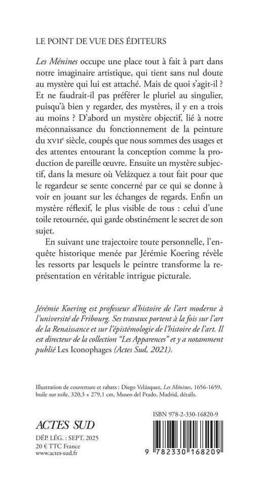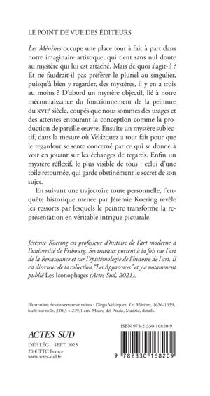 Les Ménines occupe une place particulière dans notre imaginaire artistique, qui tient aux mystères qui lui sont attachés : un mystère objectif, lié à notre méconnaissance du fonctionnement de la peinture du XVIIe siècle ; un mystère subjectif, puisque Velázquez a tout fait pour que le regardeur se sente concerné par ce qui se donne à voir ; un mystère réflexif, celui d'une toile retournée, qui garde obstinément le secret de son sujet. L'enquête historique menée par Jérémie Koering révèle les ressorts par lesquels le peintre transforme la représentation en véritable intrigue picturale.