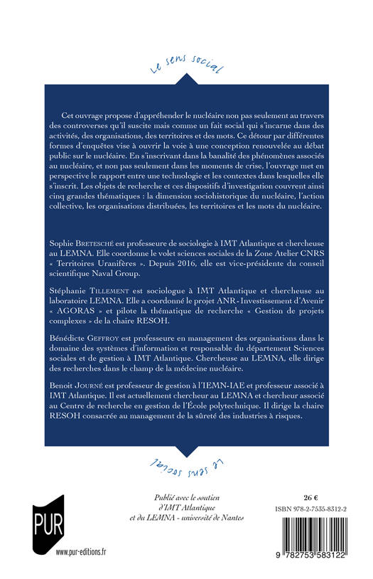 Cet ouvrage propose d'appréhender le nucléaire non pas seulement au travers des controverses qu'il suscite mais comme un fait social qui s'incarne dans des activités, des organisations, des territoires et des mots. Ce détour par différentes formes d'enquêtes vise à ouvrir la voie à une conception renouvelée au débat public sur le nucléaire. En s'inscrivant dans la banalité des phénomènes associés au nucléaire, et non pas seulement dans les moments de crise, l'ouvrage met en perspective le rapport entre une technologie et les contextes dans lesquelles elle s'inscrit. Les objets de recherche et ces dispositifs d'investigation couvrent ainsi cinq grandes thématiques : la dimension sociohistorique du nucléaire, l'action collective, les organisations distribuées, les territoires et les mots du nucléaire.