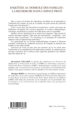 Que se passe-t-il lorsque des chercheurs travaillant sur la parentalité et l'éducation des enfants au sein de la famille ont pour terrain de recherche l'espace privé du domicile ? Leurs savoir-faire qui découlent d'expériences variées provenant de différentes disciplines des sciences humaines et sociales sont ici rassemblés. Quelles sont les spécificités de ce mode d'investigation ? Que devient la relation chercheur-enquêté ? Que faire des informations "marginales" non prévues dans le protocole ?