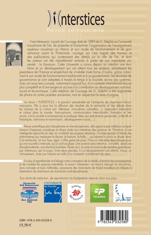 Il est intéressant, à partir de l'ouvrage daté de 1889 de G. Delphin sur l'université musulmane de Fès, d'examiner l'organisation de l'enseignement supérieur musulman au Maroc, avant le Protectorat. On y découvre des détails sur la ville de Fès et son importante université, la Karaouïn. Tout en respectant le texte d'origine, cette réédition a été enrichie de photos et de cartes postales anciennes.