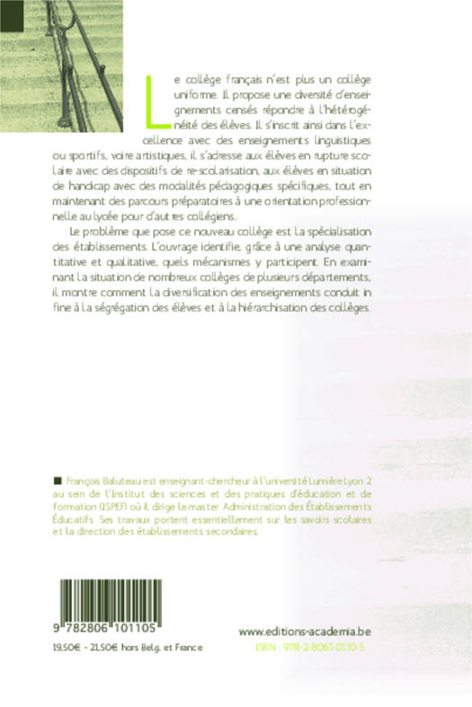 Si le collège unique français propose un tronc commun pour la majorité des élèves, il diversifie également les enseignements pour accueillir un public de plus en plus hétérogène. Cet ouvrage examine cette diversification en s'appuyant sur les résultats d'une recherche originale. Il met ainsi au jour des phénomènes de spécialisation et de hiérarchisation entre les collèges, associés à une ségrégation sociale entre les élèves.
