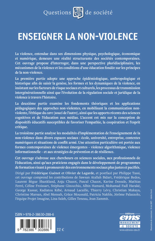 La troisième partie analyse les modalités d’implémentation de l’enseignement de la non-violence dans divers espaces sociaux : école, université, entreprise, contextes numériques et situations de conflit armé. Une attention particulière est portée aux formes contemporaines de violence émergentes – violence algorithmique, violence informationnelle – et aux stratégies de prévention et de résilience.