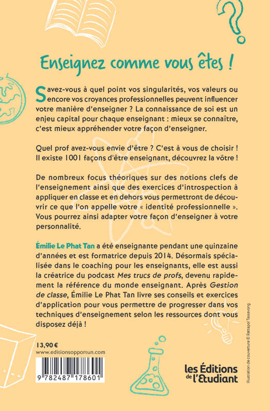 De nombreux focus théoriques sur des notions clefs de l’enseignement ainsi que des exercices d’introspection à appliquer en classe et en dehors vous permettront de découvrir ce que l’on appelle votre « identité professionnelle ». Vous pourrez ainsi adapter votre façon d’enseigner à votre personnalité.