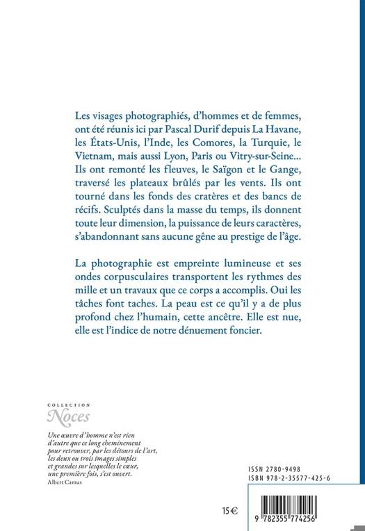 Quand le temps laisse son empreinte, les visages nous racontent leur histoireLes visages photographiés, d’hommes et de femmes, ont été réunis ici par Pascal Durif depuis La Havane, les États-Unis, l’Inde, les Comores, la Turquie, le Vietnam, mais aussi Lyon, Paris ou Vitry-sur-Seine... Ils ont remonté les fleuves, le Saïgon et le Gange, traversé les plateaux brûlés par les vents. Ils ont tourné dans les fonds des cratères et des bancs de récifs. Sculptés dans la masse du temps, ils donnent toute leur dimension, la puissance de leurs caractères, s’abandonnant sans aucune gêne au prestige de l’âge.La photographie est empreinte lumineuse et ses ondes corpusculaires transportent les rythmes des mille et un travaux que ce corps a accomplis. Oui les tâches font taches. La peau est ce qu’il y a de plus profond chez l’humain, cette ancêtre. Elle est nue, elle est l’indice de notre dénuement foncier.Les dix-huit photographes :Nadia Eeckhout - BelgiqueJeet Simar - IndeBarry Hill - Royaume-UniOlivier Blandin - Val-de-MarneChantal Générat - FranceJacky Feyfant - FranceSultan Koç - TurquieNipendranath Sarkar - IndePascal Perez - FranceErik Cabrera - CubaDzung Viet Lee - VietnamJoe Routon - États-UnisMyriam Noël alias Zoé - FranceChristian Balaguer - FranceGiuseppe Marcantonio - ItaliePascal Durif - FranceNacer Toybou Ali - ComoresMarie Manoukian - France