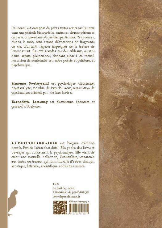 Ce recueil est composé de petits textes écrits par l’auteur dans une période bien précise, entre ses deux expériences de passe, moment analytique bien particulier. Ces poèmes, disons le mot, sont autant d’évocations de fragments de vie, d’instants fugaces imprégnés de la texture de l’inconscient. Ils sont scandés par des tableaux, oeuvres d’une artiste plasticienne, donnant ainsi à ce recueil l’occasion de conjoindre art, entre poésie et peinture, et psychanalyse.