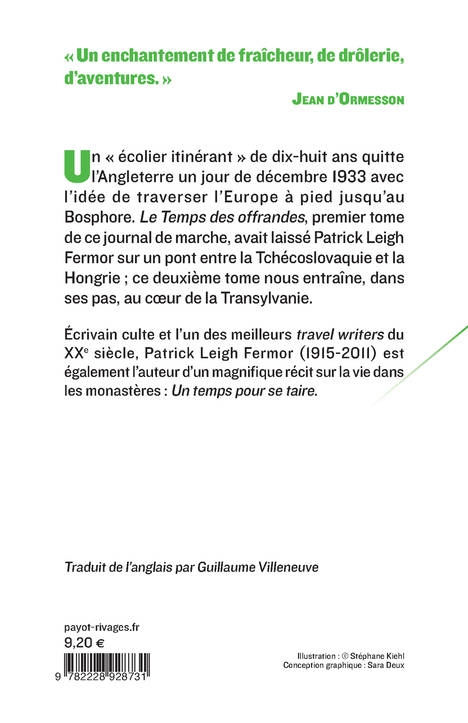 Un "écolier itinérant" de dix-huit ans quitte l'Angleterre un jour de décembre 1933 avec l'idée de traverser l'Europe à pied jusqu'au Bosphore. "Le Temps des offrandes", premier tome de ce journal de marche, avait laissé Patrick Leigh Fermor sur un pont entre la Tchécoslovaquie et la Hongrie ; ce deuxième tome nous entraîne, dans ses pas, au coeur de la Transylvanie.