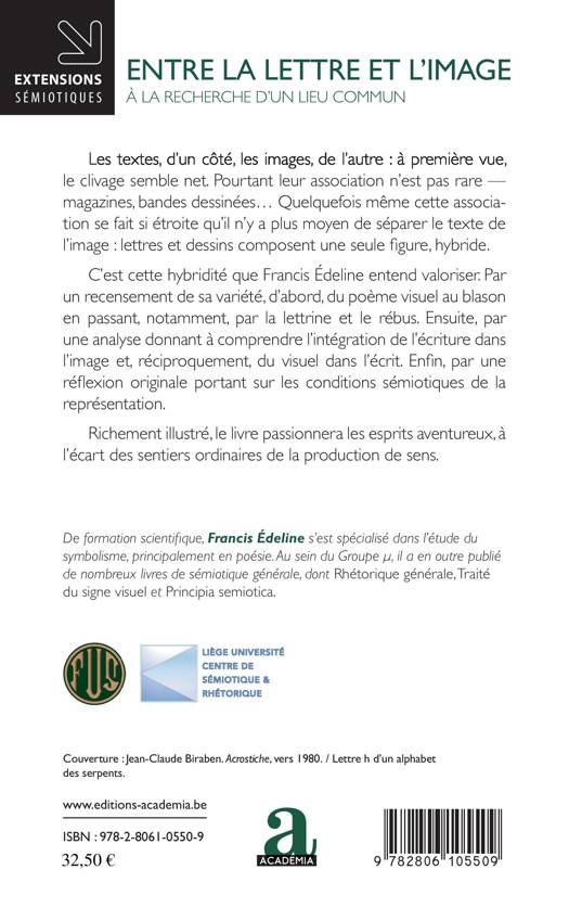 Les textes, d'un côté, les images, de l'autre : à première vue, le clivage semble net. Pourtant leur association n'est pas rare - magazines, bandes dessinées - Quelquefois même cette association se fait si étroite qu'il n'y a plus moyen de séparer le texte de l'image : lettres et dessins composent une seule figure, hybride. C'est cette hybridité que Francis Édeline entend valoriser.