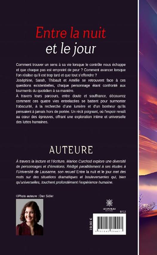 Comment trouver un sens à sa vie lorsque le contrôle nous échappe et que chaque pas est empreint de peur ? Comment avancer lorsque l'on réalise qu'il est trop tard et que tout s'effondre ? Joséphine, Sarah, Thibault et Amélie se retrouvent face à ces questions existentielles, chaque personnage étant confronté aux tourments du quotidien à sa manière. À travers leurs parcours, entre doute et souffrance, découvrez comment ces quatre vies entrelacées se battent pour surmonter l'obscurité, à la recherche d'une lumière et d'un bonheur qu'ils pensaient à jamais hors de portée. Un récit poignant, où l'espoir renaît au coeur des épreuves, offrant une exploration intime et universelle des luttes humaines.
