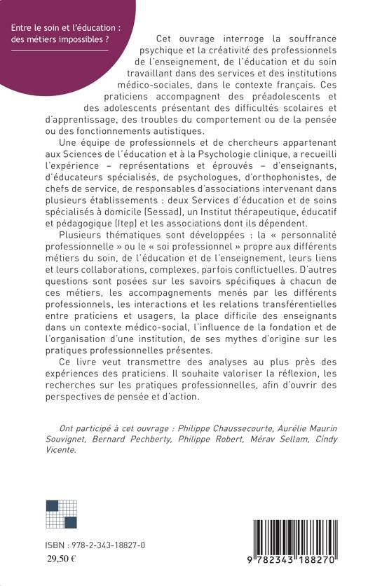 Cet ouvrage interroge la souffrance psychique et la créativité des professionnels de l'enseignement, de l'éducation et du soin travaillant dans des services et des institutions médico-sociales, dans le contexte français. Ces praticiens accompagnent des préadolescents et des adolescents présentant des difficultés scolaires et d'apprentissage, des troubles du comportement ou de la pensée ou des fonctionnements autistiques. Ce livre veut transmettre des analyses au plus près des expériences des praticiens. Il souhaite valoriser la réflexion, les recherches sur les pratiques professionnelles, afin d'ouvrir des perspectives de pensée et d'action.