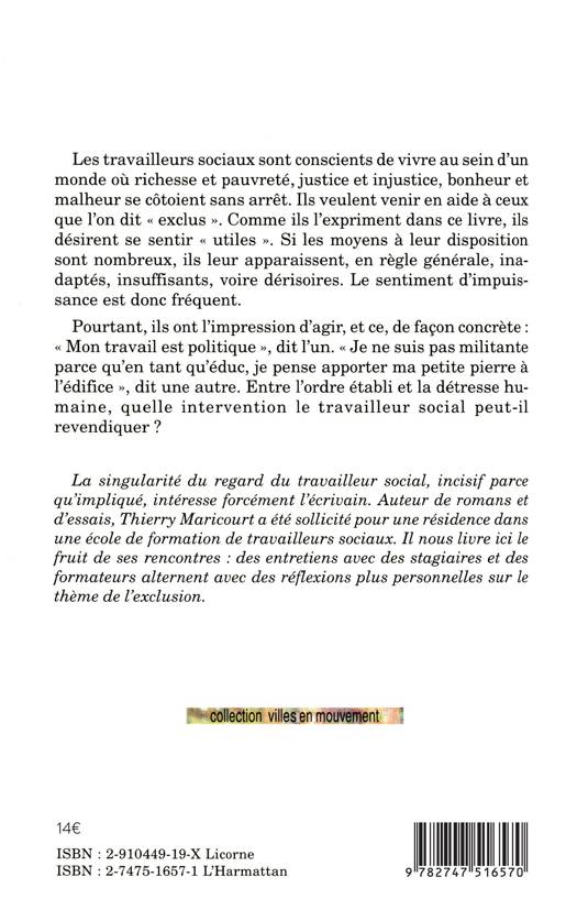 Les travailleurs sociaux sont conscients de vivre au sein d'un monde où richesse et pauvreté, justice et injustice, bonheur et malheur se côtoient sans arrêt. Ils veulent venir en aide à ceux que l'ont dit "exclus". Comme ils l'expriment dans ce livre, ils désirent se sentir "utiles". Si les moyens à leur disposition sont nombreux, ils leur apparaissent, en règle générale, inadaptés, insuffisants, voire dérisoires. Le sentiment d'impuissance est donc fréquent.