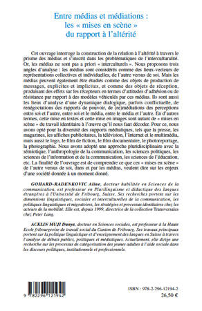 Cet ouvrage interroge la construction de la relation à l'altérité à travers le prisme des médias et s'inscrit dans les problématiques de l'interculturalité. Or, les médias ne sont pas a priori "interculturels". Les auteurs adoptent une approche pluridisciplinaire avec la sémiotique, l'anthropologie de la communication, les sciences politiques, etc. La finalité est de comprendre ce que ces "mises en scène" de l'autre versus de soi, dans et par les médias, veulent dire sur les enjeux d'une société donnée à un moment donné.