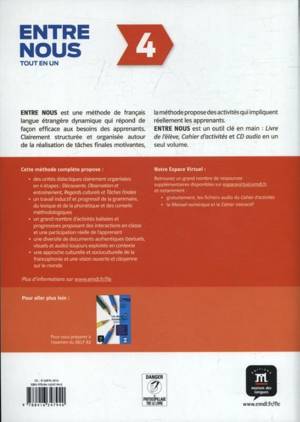 Entre nous est une méthode de français langue étrangère dynamique qui répond de façon efficace aux besoins des apprenants. Clairement structurée et organisée autour de la réalisation de tâches finales motivantes, la méthode propose des activités qui impliquent réellement les apprenants.