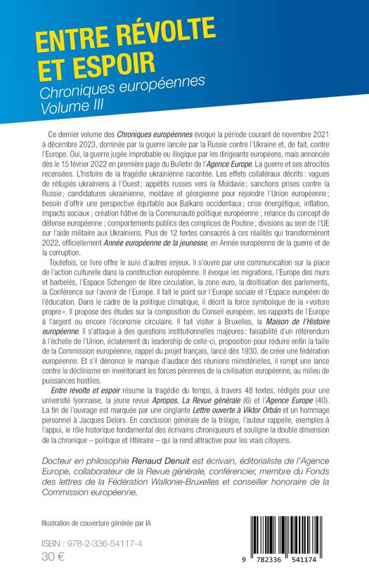 Ce dernier volume des Chroniques européennes évoque la période courant de novembre 2021 à décembre 2023, dominée par la guerre lancée par la Russie contre l'Ukraine et, de fait, contre l'Europe. Oui, la guerre jugée improbable ou illogique par les dirigeants européens, mais annoncée dès le 15 février 2022 en première page du Bulletin de l'Agence Europe. La guerre et ses atrocités recensées. L'histoire de la tragédie ukrainienne racontée. Les effets collatéraux décrits vagues de réfugiés ukrainiens à l'Ouest; appétits russes vers la Moldavie; sanctions prises contre la Russie; candidatures ukrainienne, moldave et géorgienne pour rejoindre l'Union européenne; besoin d'offrir une perspective équitable aux Balkans occidentaux; crise énergétique, inflation, impacts sociaux; création hâtive de la Communauté politique européenne; relance du concept de défense européenne; comportements publics des complices de Poutine; divisions au sein de l'UE sur l'aide militaire aux Ukrainiens. Plus de 12 textes consacrés à ces réalités qui transformèrent 2022, officiellement Année européenne de la jeunesse, en Année européenne de la guerre et de la corruption. Toutefois, ce livre offre le suivi d'autres enjeux. Il s'ouvre par une communication sur la place de l'action culturelle dans la construction européenne. Il évoque les migrations, l'Europe des murs et barbelés, l'Espace Schengen de libre circulation, la zone euro, la droitisation des parlements, la Conférence sur l'avenir de l'Europe. Il fait le point sur l'Europe sociale et l'Espace européen de l'éducation. Dans le cadre de la politique climatique, il décrit la force symbolique de la voiture propre . Il propose des études sur la composition du Conseil européen, les rapports de l'Europe à l'argent ou encore l'économie circulaire. Il fait visiter à Bruxelles, la Maison de l'Histoire européenne. Il s'attaque à des questions institutionnelles majeures: faisabilité d'un référendum à l'échelle de l'Union, éclatement du leadership de celle-ci, proposition pour réduire enfin la taille de la Commission européenne, rappel du projet français, lancé dès 1930, de créer une fédération européenne. Et s'il dénonce le manque d'audace des réunions ministérielles, il rompt une lance contre le déclinisme en inventoriant les forces pérennes de la civilisation européenne, au milieu de puissances hostiles. Entre révolte et espoir résume la tragédie du temps, à travers 48 textes, rédigés pour une université lyonnaise, la jeune revue Apropos, La Revue générale (6) et l'Agence Europe (40). La fin de l'ouvrage est marquée par une cinglante Lettre ouverte à Viktor Orbán et un hommage personnel à Jacques Delors. En conclusion générale de la trilogie, l'auteur rappelle, exemples à l'appui, le rôle historique fondamental des écrivains chroniqueurs et souligne la double dimension de la chronique - politique et littéraire - qui la rend attractive pour les vrais citoyens.