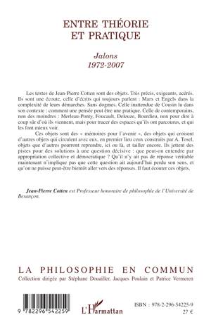 "Mémoire pour l'avenir", les textes de Jean-Pierre Cotten jettent des pistes pour des solutions à une question décisive : que peut-on entendre par approbation collective et démocratique ? Très précis, exigeants, acérés, ces objets textuels sont une écoute, celle d'écrits qui toujours parlent : Marx et Engels dans la complexité de leurs démarches. Sans dogmes. Celle de la pensée pratique de Cousin, lu dans son contexte. Celle de contemporains : Merleau-Ponty, Foucault, Deleuze, Bourdieu, pour tracer des espaces qu'ils ont parcouru, et qui les font mieux voir.