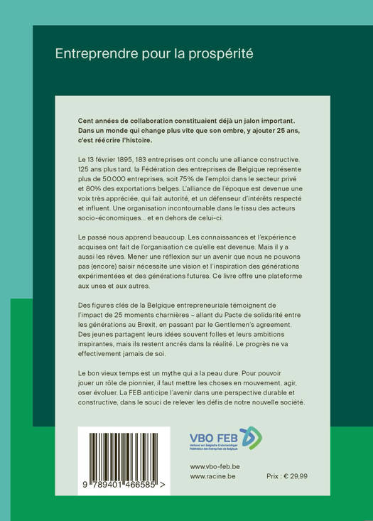 Des figures clés de la Belgique entrepreneuriale témoignent de l'impact de 25 moments charnières - allant du Pacte de solidarité entre les générations au Brexit, en passant par le Gentlemen's agreement. Des jeunes partagent leurs idées souvent folles et leurs ambitions inspirantes, mais ils restent ancrés dans la réalité. Le progrès ne va effectivement jamais de soi.