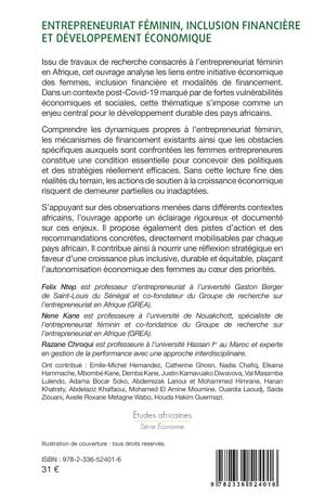 Issu de travaux de recherche consacrés à l'entrepreneuriat féminin en Afrique, cet ouvrage analyse les liens entre initiative économique des femmes, inclusion financière et modalités de financement. Dans un contexte post-Covid-19 marqué par de fortes vulnérabilités économiques et sociales, cette thématique s'impose comme un enjeu central pour le développement durable des pays africains. Comprendre les dynamiques propres à l'entrepreneuriat féminin, les mécanismes de financement existants ainsi que les obstacles spécifiques auxquels sont confrontées les femmes entrepreneures constitue une condition essentielle pour concevoir des politiques et des stratégies réellement efficaces. Sans cette lecture fine des réalités du terrain, les actions de soutien à la croissance économique risquent de demeurer partielles ou inadaptées. S'appuyant sur des observations menées dans différents contextes africains, l'ouvrage apporte un éclairage rigoureux et documenté sur ces enjeux. Il propose également des pistes d'action et des recommandations concrètes, directement mobilisables par chaque pays africain. Il contribue ainsi à nourrir une réflexion stratégique en faveur d'une croissance plus inclusive, durable et équitable, plaçant l'autonomisation économique des femmes au coeur des priorités.