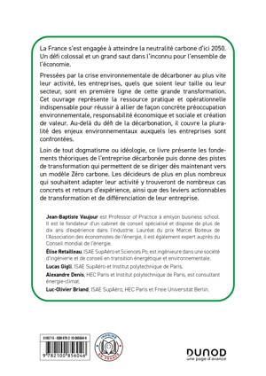 Loin de tout dogmatisme ou idéologie, ce livre présente les fondements théoriques de l’entreprise décarbonée puis donne des pistes de transformation qui permettent de se diriger dès maintenant vers un modèle Zéro carbone. Les décideurs de plus en plus nombreux qui souhaitent adapter leur activité y trouveront de nombreux cas concrets et retours d’expérience, ainsi que des leviers actionnables de transformation et de différenciation de leur entreprise.