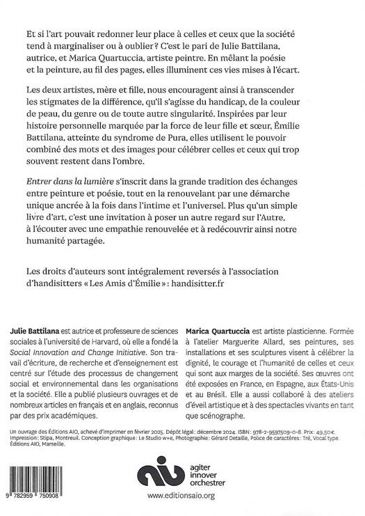 Les deux artistes, mère et fille, nous encouragent ainsi à transcender les stigmates de la différence, qu'il s'agisse du handicap, de la couleur de peau, du genre ou de toute autre singularité. Inspirées par leur histoire personnelle marquée par la force de leur fille et sœur, Emilie Battilana, atteinte du syndrome de Pura, elles utilisent le pouvoir combiné des mots et des images pour célébrer celles et ceux qui trop souvent restent dans l'ombre.