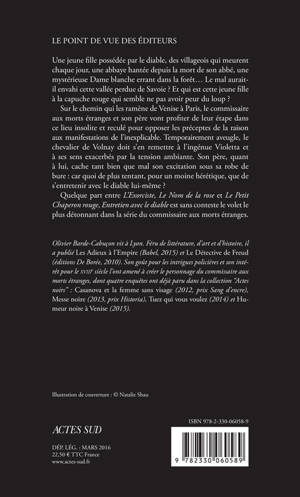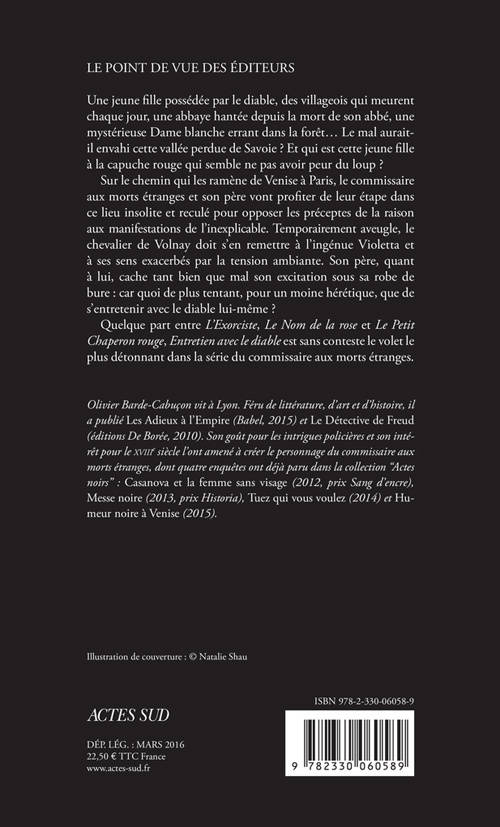 Sur le chemin qui les ramène de Venise à Paris, le commissaire aux morts étranges et son père vont profiter de leur étape dans ce lieu insolite et reculé pour opposer les préceptes de la raison aux manifestations de l'inexplicable. Temporairement aveugle, le chevalier de Volnay doit s'en remettre à l'ingénue Violetta et à ses sens exacerbés par la tension ambiante. Son père, quant à lui, cache tant bien que mal son excitation sous sa robe de bure : car quoi de plus tentant, pour un moine hérétique, que de s'entretenir avec le diable lui-même ?