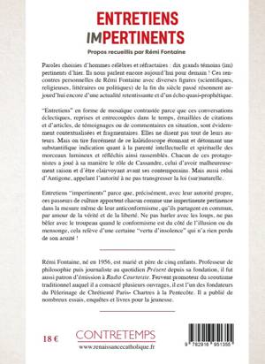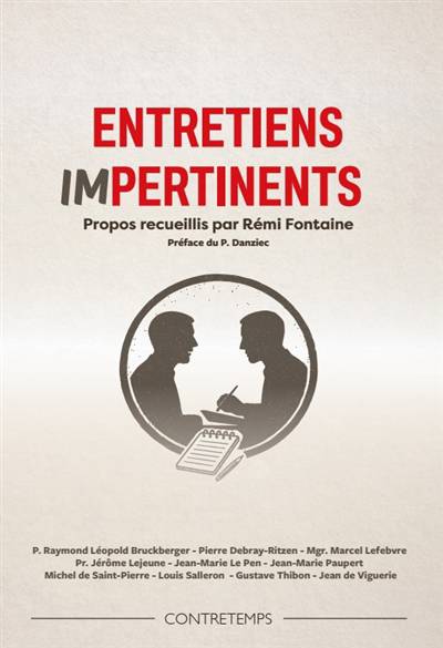 Entretiens avec: ⢠Le professeur Jérôme Lejeune : De la guerre atomique au comité d'éthique ⢠Mgr Marcel Lefebvre : Laissez-nous faire l'expérience de la Tradition ! ⢠Jean-Marie Paupert : L'oubli des Mères Patries : il y a péril en la demeure ⢠Michel de Saint-Pierre : Sous le soleil de Dieu mais avec les fumées de Satan ⢠Pierre Debray-Ritzen : Science, idéologie et philosophie ⢠Le P. R-L Bruckberger : Dissidence et avenir de l'Église, Amérique et peine de mort ⢠Gustave Thibon : La grâce et la pesanteur : de Simone Weil à Charles Péguy ⢠Louis Salleron : Diffuser la propriété privée, défendre la messe traditionnelle ⢠Jean de Viguerie : Libertés universitaires, catholicisme et patrie