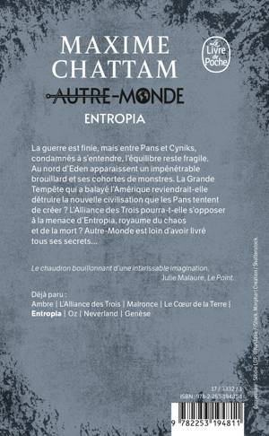 La guerre est finie. Entre Pans et Cyniks, condamnes a s'entendre, l'equilibre reste fragile. Au nord d'Eden, apparaissent un impenetrable brouillard et ses cohortes de monstres. La Grande Tempete qui a balaye l'Amerique reviendrait-elle detruire la nouvelle civilisation que les Pans tentent de creer ? L'Alliance des Trois pourra-t-elle s'opposer a la menace d'Entropia, royaume du chaos et de la mort ? Autre-Monde est loin d'avoir livre tous ses secrets...Le chaudron bouillonnant d'une intarissable imagination. Julie Malaure, Le Point.