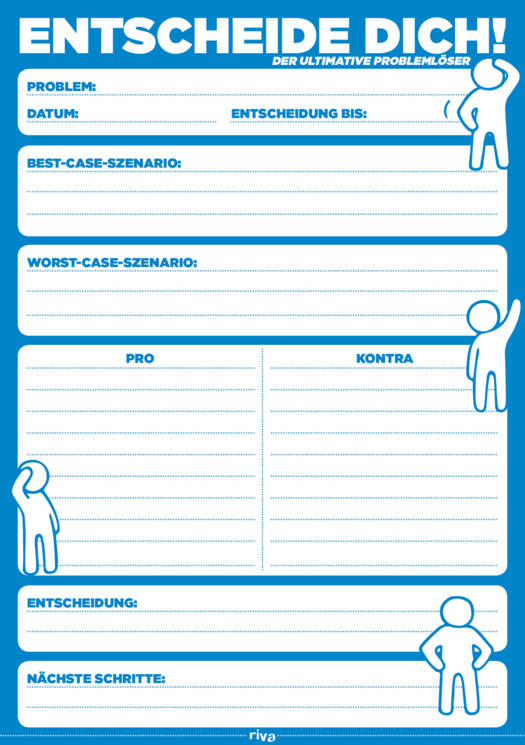 Täglich treffen wir mehrere Hundert Entscheidungen. Die meisten davon unbewusst und in Sekundenschnelle. Doch es gibt auch Entscheidungen, die wohl bedacht sein sollten, und bei denen es Pro und Kontra abzuwägen gilt. Eigens dafür wurde der praktische Block Entscheide dich! entwickelt. Auf nur einer Seite lassen sich alle Facetten eines Problems zusammenfassen und veranschaulichen. So wird es einLeichtes sein, die richtige Entscheidung zu treffen.
