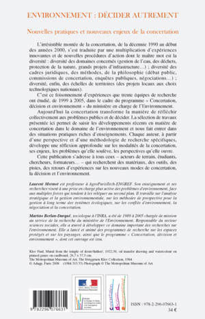 L'irrésistible montée de la concertation, des années 1990 à 2000, s'est traduite par une multiplication d'expériences innovantes et de nouvelles procédures d'action dont le maître mot est la diversité : diversité des domaines, diversité des cadres juridiques, des méthodes, de la philosophie et des échelles de territoires. Cette sélection de travaux présentés permet de saisir les développements récents en matière de concertation dans le domaine de l'environnement.